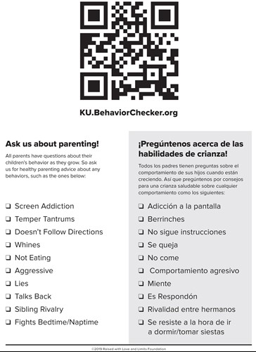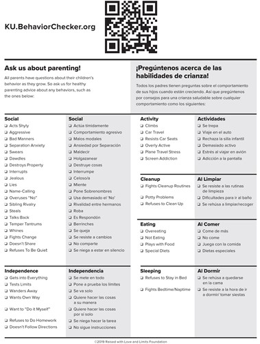 The “Ask Us About Parenting” Checklist features all the behaviors in Behavior Checker (in English and Spanish). It helps parents and you get on the same page—talk the same language—about childhood behavior problems that parents are having trouble solving.